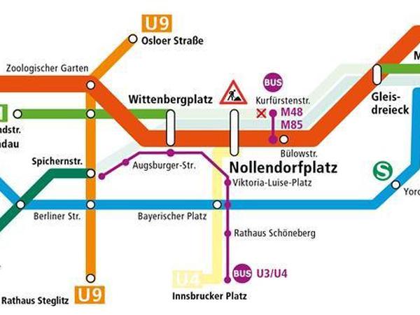 Die BVG plant in den Wochen vor Beginn der Sperrung eine intensive Information. Umständlich wird es vor allem für Fahrgäste, die von Kreuzberg nach Dahlem zur FU wollen. Sie müssen dreimal umsteigen: Am Gleisdreieck in die U2, am Zoo in die U9 und an der Spichernstraße dann in die U3. An allen drei Bahnhöfen müssen Treppen und teilweise lange Wege bewältigt werden.