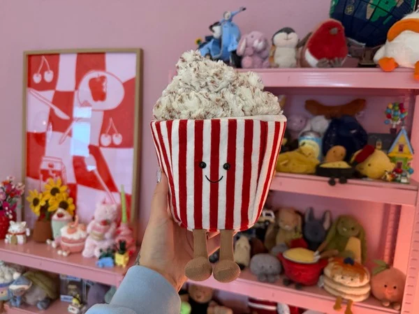 Mein erster Kontakt mit Jellycat vor ziemlich genau drei Jahren war erstaunlich unspektakulär: Ich war mit einer Freundin bummeln, zufällig landeten wir in der Spielzeugabteilung. Dass es dort auch lustig aussehende Kuscheltiere von Essen gibt, wusste ich. Aber genau angeschaut hatte ich sie nie. Mich lachte an dem Nachmittag ein Popcorn-Tier an: eine rot-weiß gestreifte Tüte, oben rausschauendes Plüschpopcorn, ein süßes Gesicht und zwei braune Beine aus Cord. Für mich als Kino-Liebhaberin genau die richtige Deko.