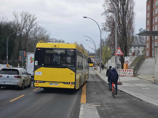 Radfahrer haben in beide Richtungen bereits jetzt eigene abgetrennte Spuren. Gefährlich wird es für Radfahrer ausgerechnet durch BVG-Busse. Die wechseln trotz durchgezogener Linie direkt hinter der neuen Brücke auf die Radspur, um den Stau bis zur 200 Meter entfernten Haltestelle am S-Bahnhof zu umfahren.