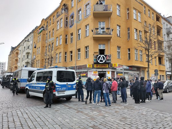Vor dem Haus versammelten sich währenddessen rund 20 bis 30 Menschen. Sie protestierten mit Sprechchören wie „Bullenschweine raus aus den Kiezen“ und hielten Plakate mit Aufschriften wie „Solidarität ist unsere Waffe“ oder „Reichtum abschaffen“ hoch. Aus einem Fenster im ersten Stock drang laute Musik auf die Straße. Nach dem Einsatz begannen mehrere Personen, den Infoladen im Erdgeschoss aufzuräumen und beschädigtes Material zu ordnen. „Wenn die jetzt nichts gefunden haben, wer bezahlt dann die Scheibe?“, fragt der Späti-Besitzer.