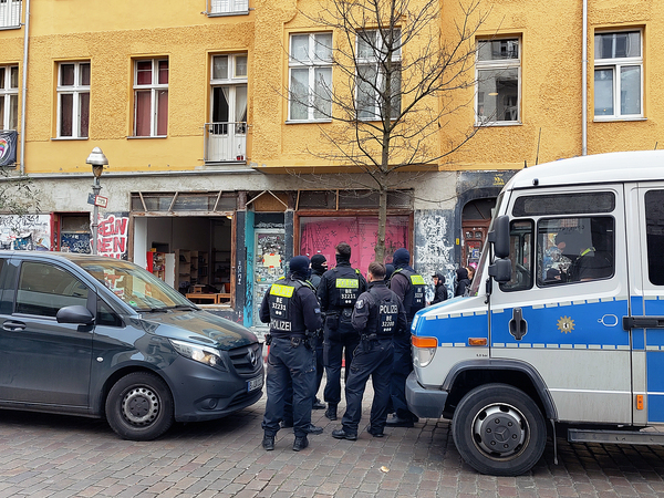 Laut Sicherheitsbehörden lief der Einsatz unter anderem in der „Anarchistischen Bibliothek Kalabal!k“ an der Reichenberger Straße in Kreuzberg. Wie ein Tagesspiegel-Reporter vor Ort berichtete, schirmten mehrere Polizisten die Bibliothek ab, acht Polizeiwagen standen rund um den Eingang. Immer wieder wurden Sachen herausgetragen und in einem der Fahrzeuge verstaut.