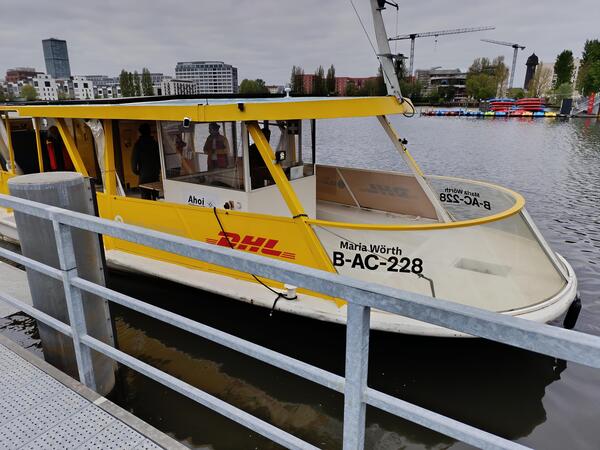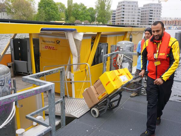 Die Pakete kommen per Lastwagen nach Oberschöneweide, werden dort aufs Schiff geladen und dann verteilt. Die Tour führt nach Köpenick, bis in die Rummelsburger Bucht oder zum ehemaligen Osthafen nahe der Oberbaumbrücke. Das Schiff, die Maria Wörth vom Wörthersee, hat die DHL von der Reederei Solarwaterworld gechartet. Die stellt auch den Schiffsführer.