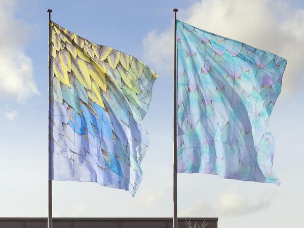 Die Tarnnetze sind aus Stoffresten zusammengeflochten, der Künstler Fabian Knecht hat diese Behelfsnetze aus der Ukraine mitgebracht, wo sie allerorten genauso in gemeinschaftlichen Knüpfaktionen hergestellt werden. Im Gegenzug ließ er professionelle Tarnnetze in die Ukraine schicken. Nun weht im Wind die Frage nach Solidarität und Gemeinschaft.
