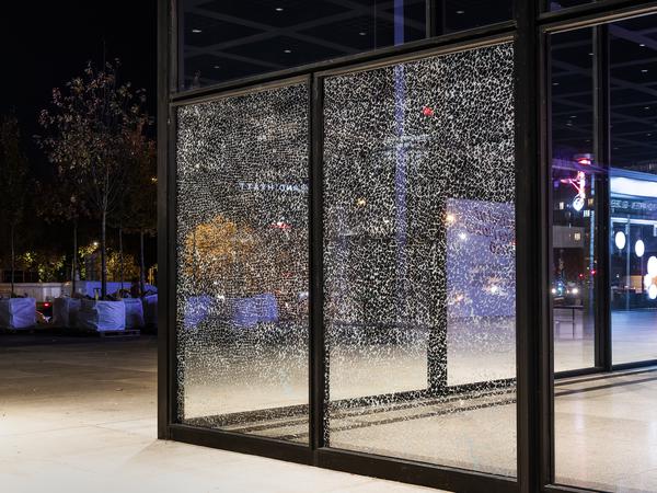 Die kaputte Scheibe ist übrigens auch eine optische Täuschung. Die Künstlerin Nina Schuiki simuliert die Sprünge in der großen Nationalgalerie-Glasfront mit einer Folie. Das Glas ist nur noch eine höchst fragile Barriere. Schuiki hat im Inneren der Nationalgalerie außerdem einen glitzernden Teppich aus Glassteinchen auslegt, der sich auf der Terrasse scheinbar fortsetzt, das Glas stammt aus kaputtgehauenen Scheiben im Berliner Stadtraum.