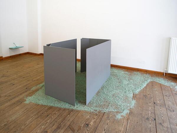 Zwei gekantete Aluminiumplatten stehen sich gegenüber und bilden einen an zwei Ecken geöffneten Raum. Am Boden liegen ausgestreut grünliche Kehrspäne, wie sie zum Reinigen von Industriehallen und Werkstätten benutzt werden.