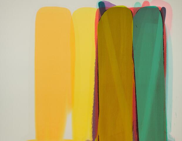 Echte Farbwunder sind Nick Dawes’ Gemälde. Flachsgelb, loderndes Rot, Wasserblau und ein türkises Grün legen sich in vertikalen Bahnen übereinander, Schicht für Schicht, ohne zu verlaufen. Die Ausstellung „Trace Elements“ versammelt ein knappes Dutzend Werke, von denen einige knapp drei Meter lang sind.