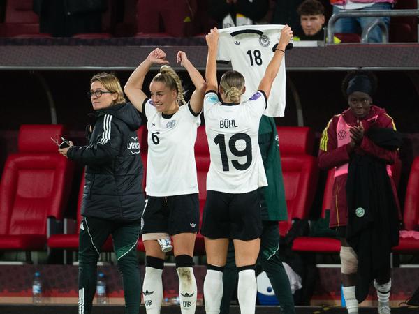 Zehn Minuten vor Ende war es schließlich Klara Bühl, die für die große Erlösung sorgte. Nach einem langen Flugball zog sie in die Mitte und schloss mit einem satten Schuss aus rund 18 Metern ins linke untere Eck ab. Anschließend rannte sie zu Giulia Gwinn an die Seitenlinie, die das Trikot mit der Nummer sechs trug, das eigentlich für Lena Oberdorf gedacht war. Bühl hielt derweil die Nummer 18 in die Luft – das Trikot von Giovanna Hoffmann.