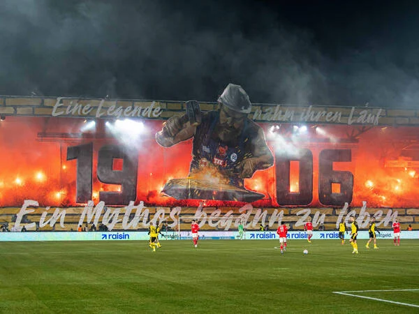 Das erste Highlight gab es schon vor dem Anpfiff. Am Dienstag war Union 60 Jahre alt geworden und das feierten die Berliner Fans mit einer großen Choreo ganz im Zeichen der Schlosserjungs aus Oberschöneweide. „Eine Legende nahm ihren Lauf, ein Mythos begann zu leben“, war auf der Waldseite zu lesen, dazu die Jahreszahl 1906, als der Vorgängerverein Union Oberschöneweide gegründet wurde.